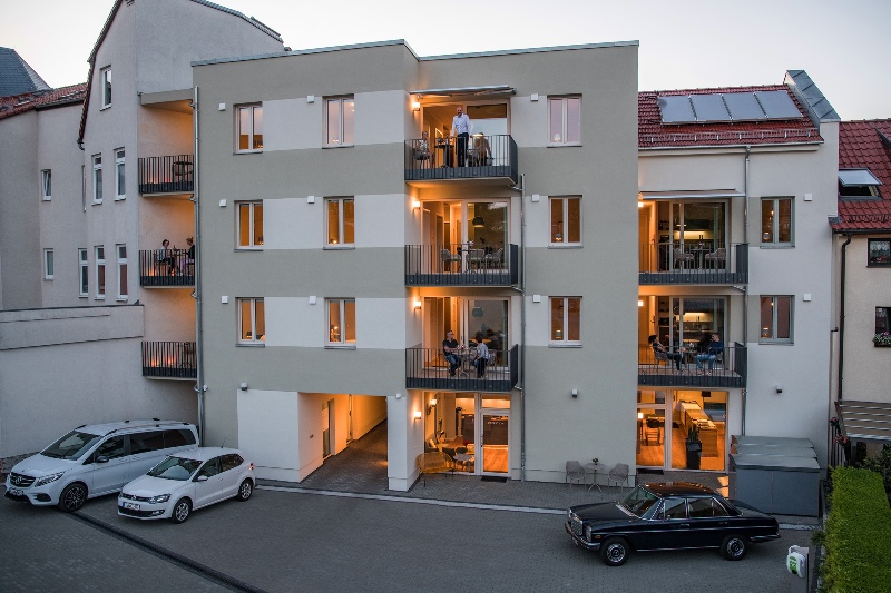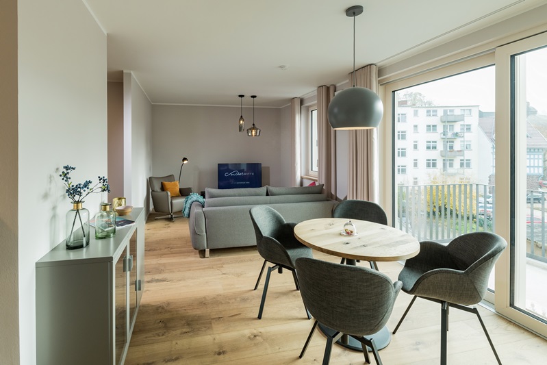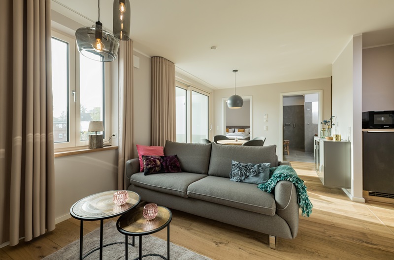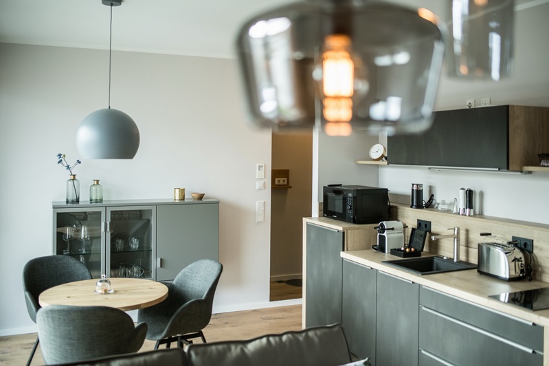 Das Ehepaar hat das Hotel sorgfältig und mit viel Liebe zum Detail geplant und so lässt die Ausstattung keine Wünsche offen. Auf dem geschlossenen Innenhof stehen Parkplätze mit E-Ladestationen und abschließbare Fahrradboxen bereit. Der Lift bringt die Gäste in eine der acht stilvoll eingerichteten und lichtdurchfluteten Suiten mit Südbalkon für jeweils 1-4 Personen. Suiten, weil Sie komfortabel und ganzheitlich ausgestattet sind und jeweils über eine Küche und ein extra Schlafzimmer verfügen. Die Eichendielen verströmen Geborgenheit und ein Stück Natur, die großen Boxspringbetten sind der Platz für Träume – Designmöbel, bodengleiche Duschen und viele praktische Details runden das Wohnfühl-Konzept ab.