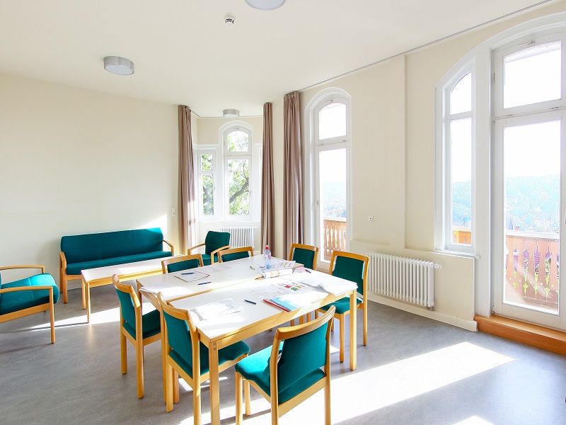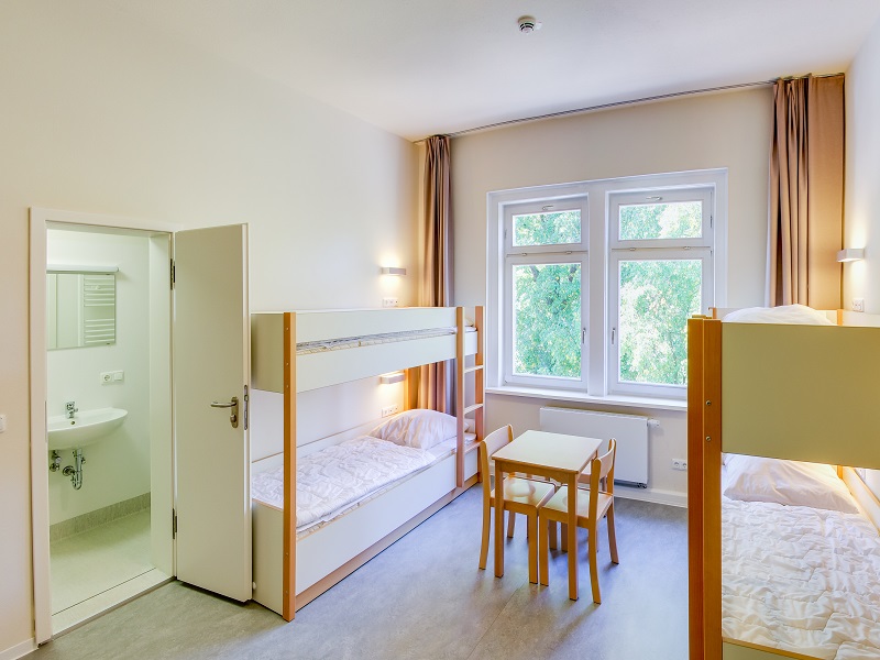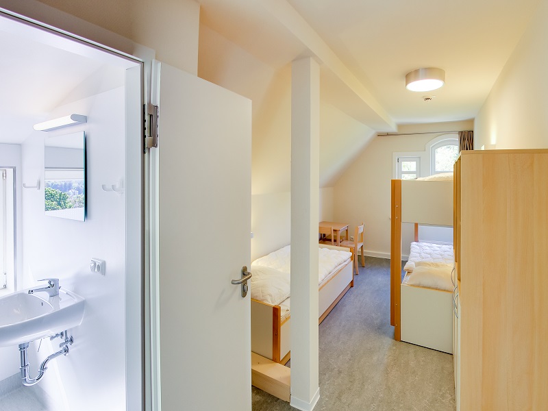 Surrounded by greenery and situated at the foot of the Wartburg castle, our house offers 22 rooms for groups as well as for private persons. In the main house, the bedrooms are arranged on three floors. Our bright dining room with its pleasant atmosphere and plenty of space invites you to eat together. Our single to five-bed rooms are partly equipped with bunk beds and offer space for a total of 59 people. They are brightly and friendly furnished. Each room has its own bathroom with washbasin, shower and toilet. Many of the rooms have their own balcony access, which offers a fantastic view over the southern part of Eisenach. Below the house, there is a parking lot and a playground with a ping-pong table and space for further outdoor activities. Behind our main house, there is the new building with a kicker room and other leisure facilities. The surrounding area invites you for walks through the forest or the Eisenach South Quarter and the historical city centre is only a few minutes walk away.