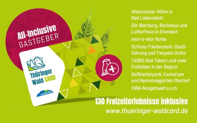 Für Ihren Aufenthalt in der Unterkunft erhalten Sie automatisch die All-Inclusive-Gästekarte - kostenfreier Eintritt bei rund 130 Freizeiteinrichtungen im Thüringer Wald. Weiterführende Informationen finden Sie unter www.thueringer-waldcard.de
