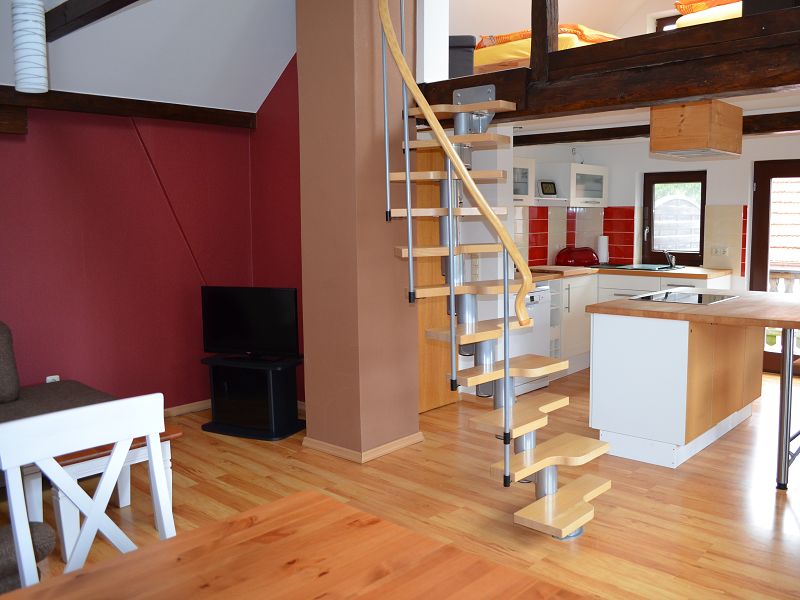 Im Erdgeschoss befindet sich ein Schlafzimmer mit Doppelbett und TV sowie das Badezimmer mit Badewanne. Im Obergeschoss finden Sie das Wohnzimmer mit offener Küche und einen Spitzboden mit zwei weiteren Schlafmöglichkeiten.